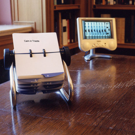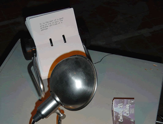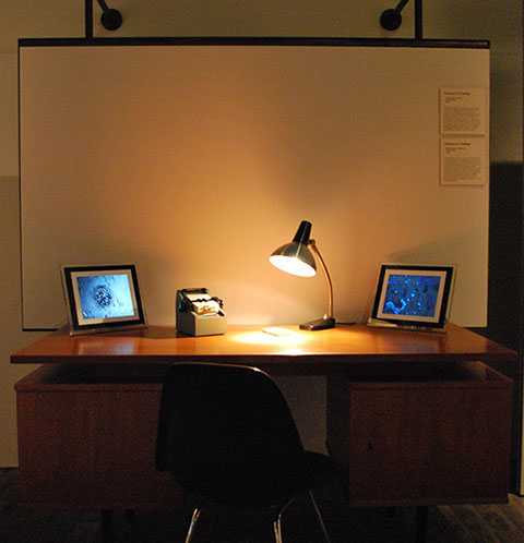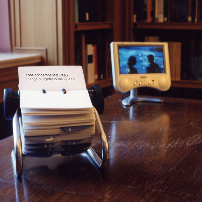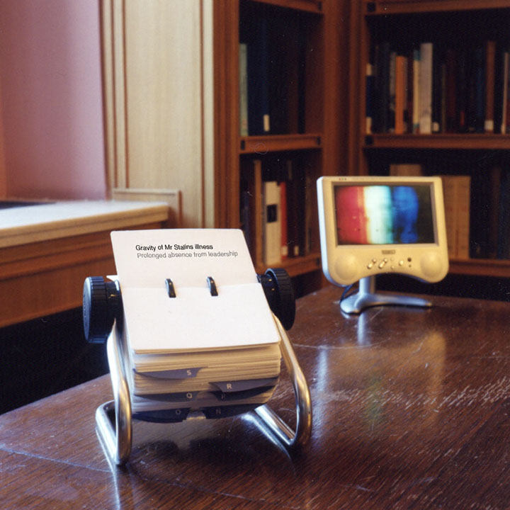 A Commission for the DNA50 anniversary from the Wellcome Trust, this project travelled to Leiden, Haaselt, Gothenburg, and Edinburgh from its original venue: the Biographical Room in the Wellcome Trust Library, Euston Road London. Video from the 1960 Seattle Worlds fair showing a spectacularised set of DNA models was juxtaposed with a rolodex card file which combined fragments from media sources during March 1953 with extracts from the writings and talks of Professor Maurice Wilkins. Wilkins was the quiet and reserved DNA pioneer, whose moral sense led to his key role in the foundation of the BSSRS (British Society for Social Responsibility in Science). In addition, an editioned flickbook using elements from the film was freely available from the library desk. The installation evolved in different venues, with two facing video elements: