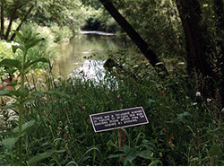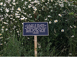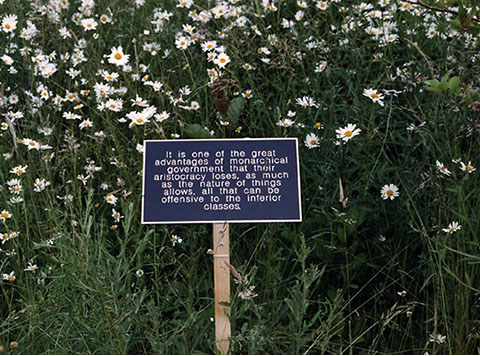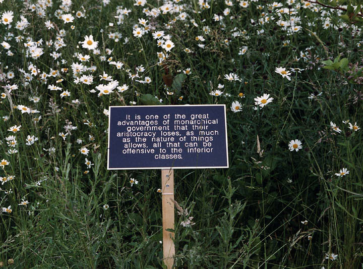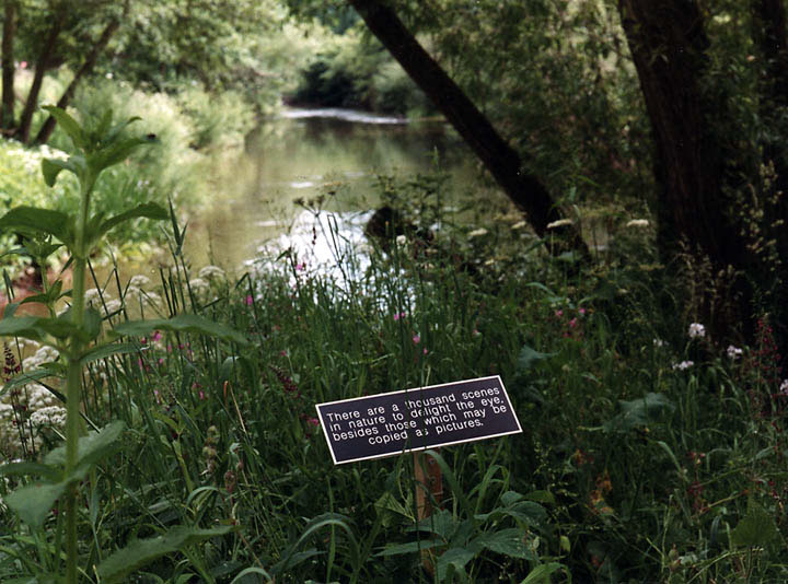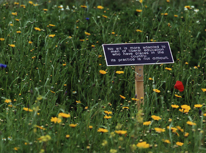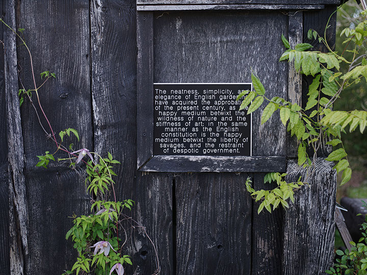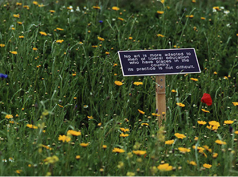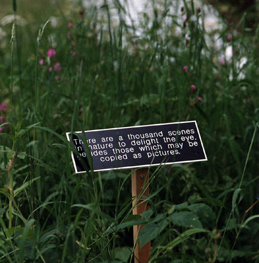 Philosophical texts from picturesque landscape theorists, presented as botanical signage in a rural environment.